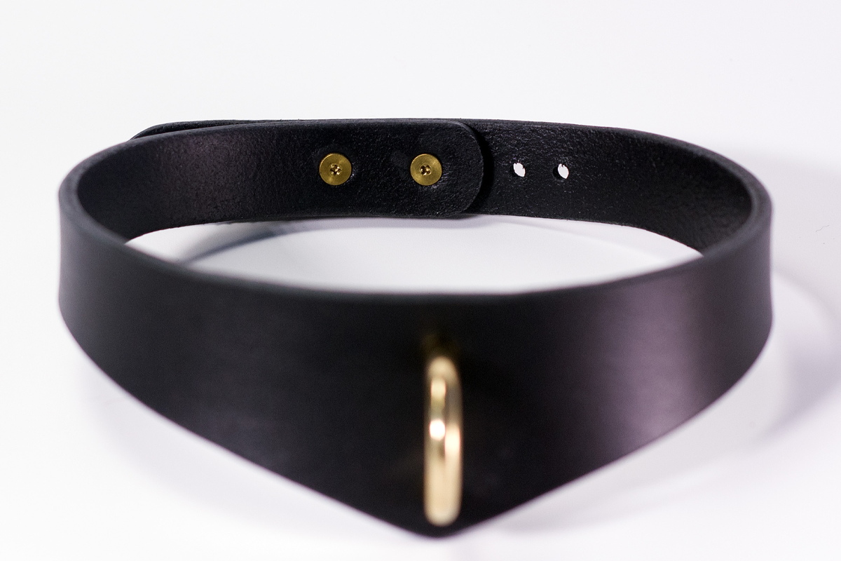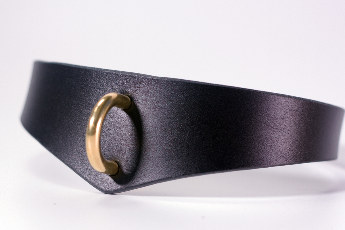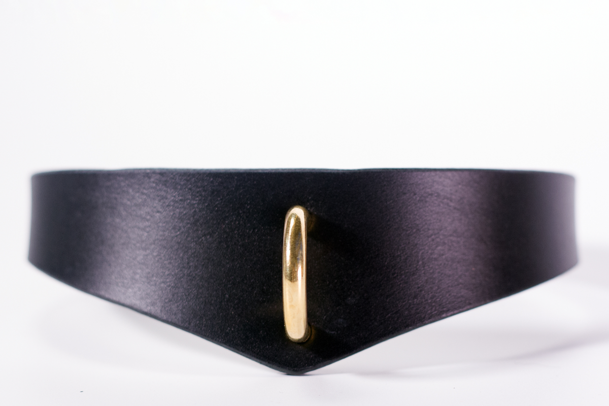 Ошейник стильной формы, единый отрез натуральной кожи и металлическое кольцо для поводка в центре...